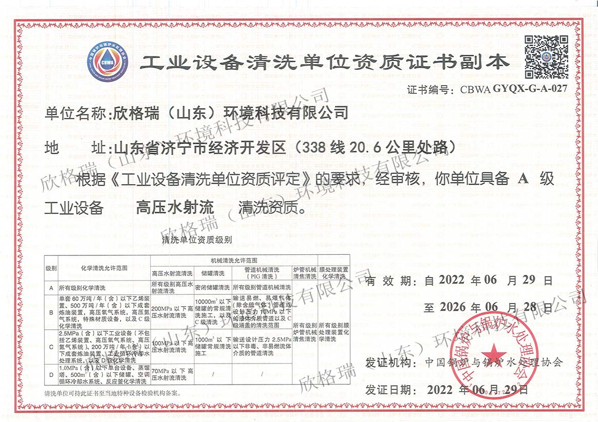 工業設備高壓水清洗、PIG清洗、儲罐清洗A級資質